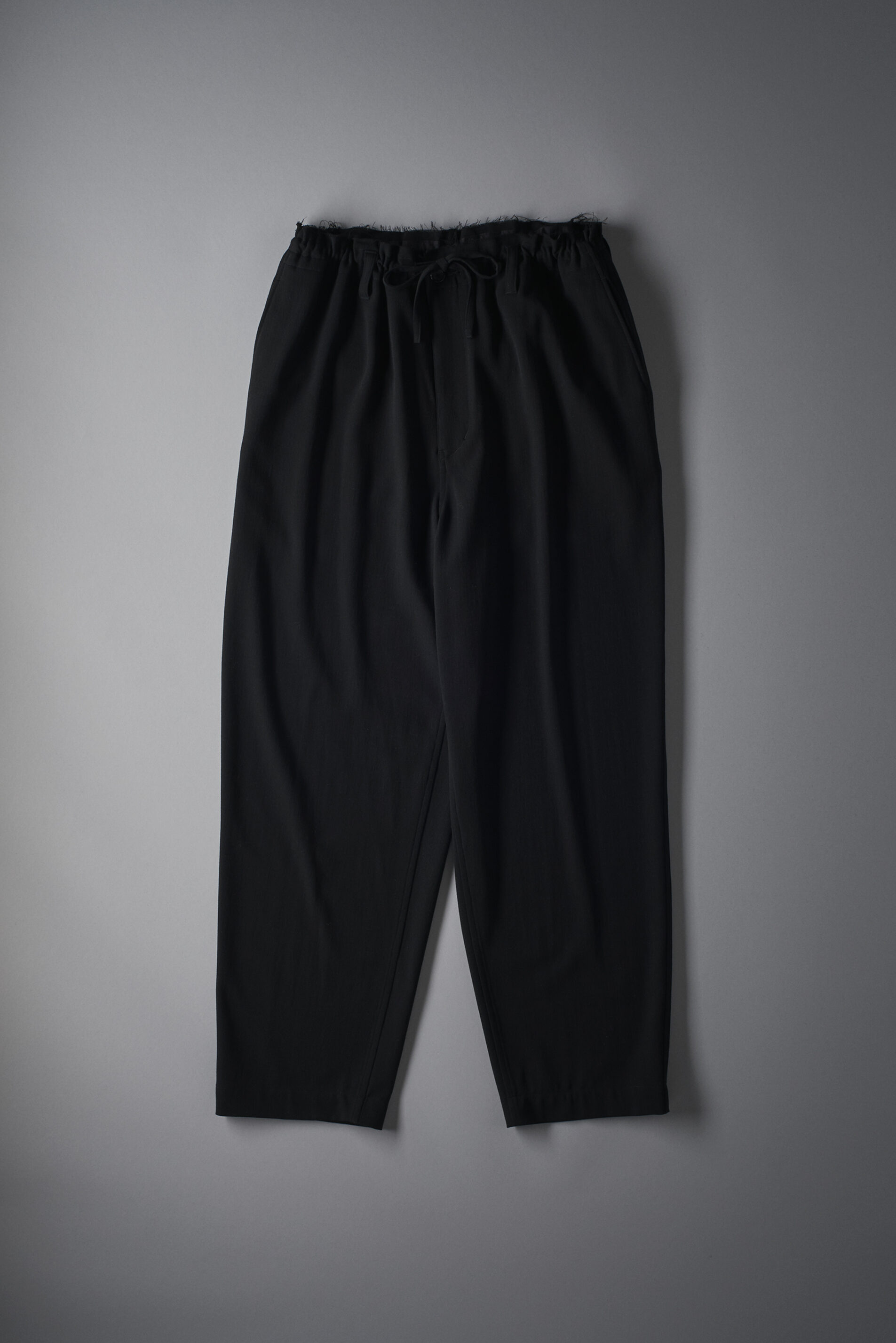 ドライな肌合いと、しなやかなドレープをもつオーストラリア産メリノによる3/2の綾織。 あらかじめ経糸の浮きを多く残した織組織と不均一に仕上げられた撚糸によって、最終工程のワッシャーによる縮みを大きく生じさせ、せり出すような密度の高い織目を作りあげています。 <一重仕立て> <ワイド型、ストレート> <脇ポケット2ケ、後ろポケット2ケ>