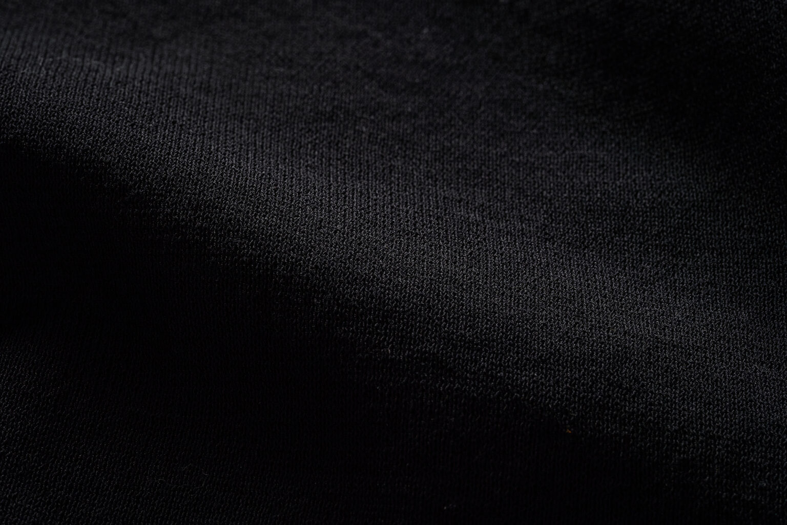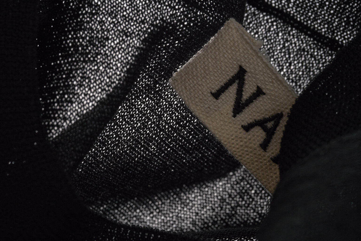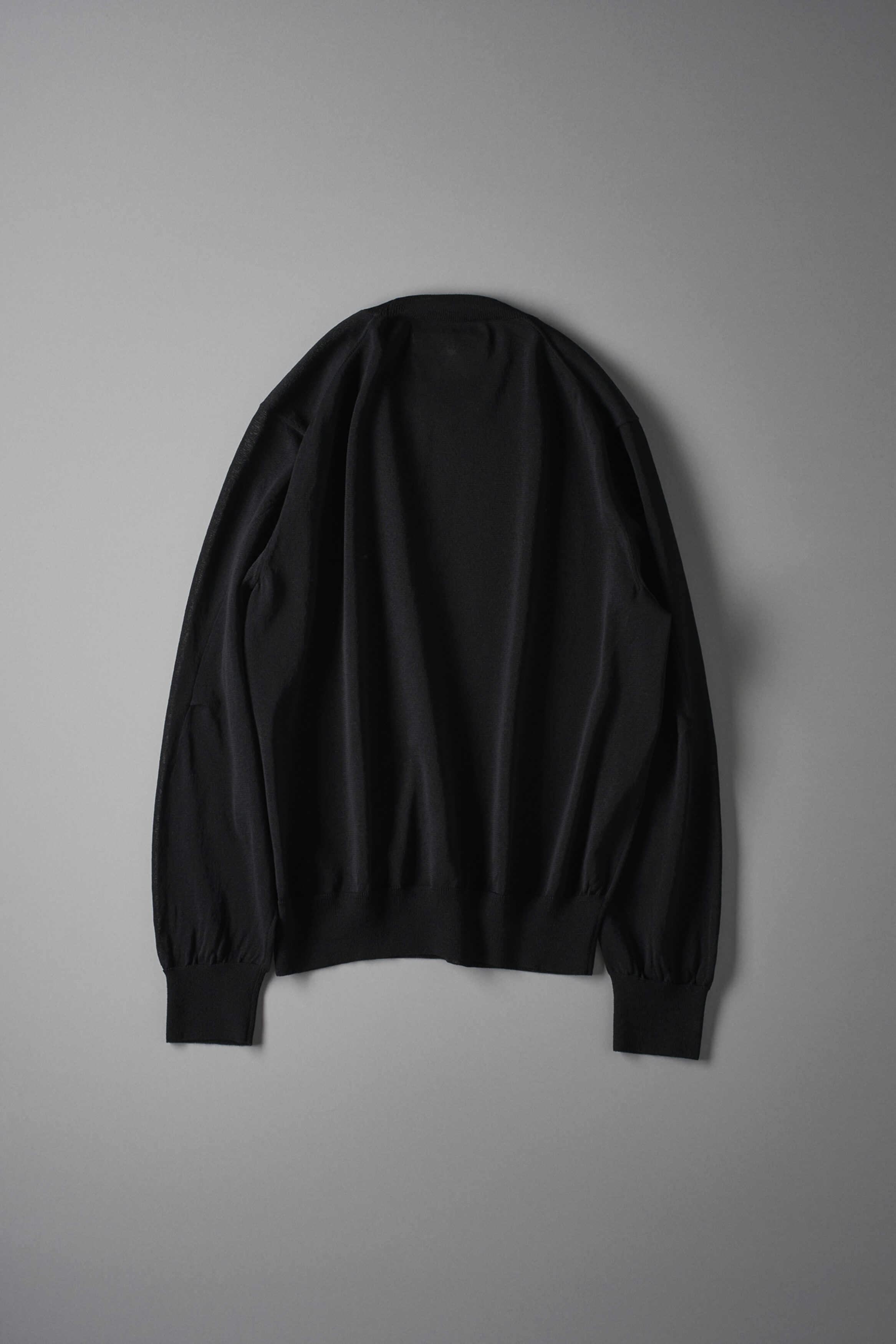 混紡糸に20デニールほどの極めて細いポリエステルが巻かれた特殊な構造の糸により、天然繊維を想起させる自然な表情をもちつつ合成繊維の塑性によって、うっすらと透けるほどの繊細な編地でありながらも空気を含んだ柔らかなシルエットを生みだしています。