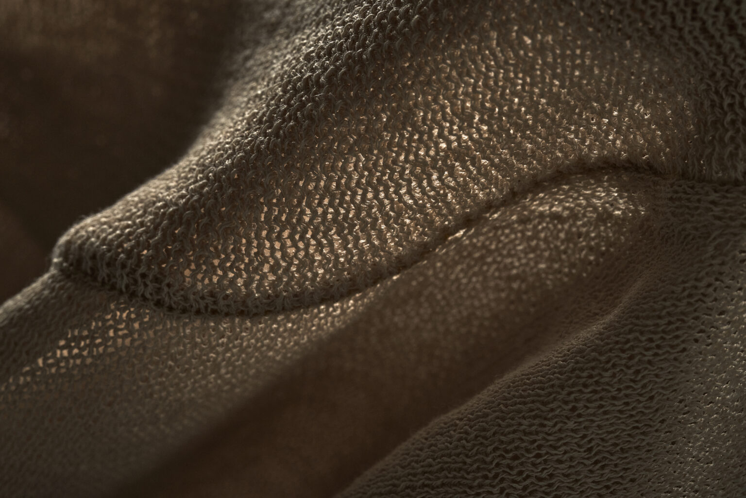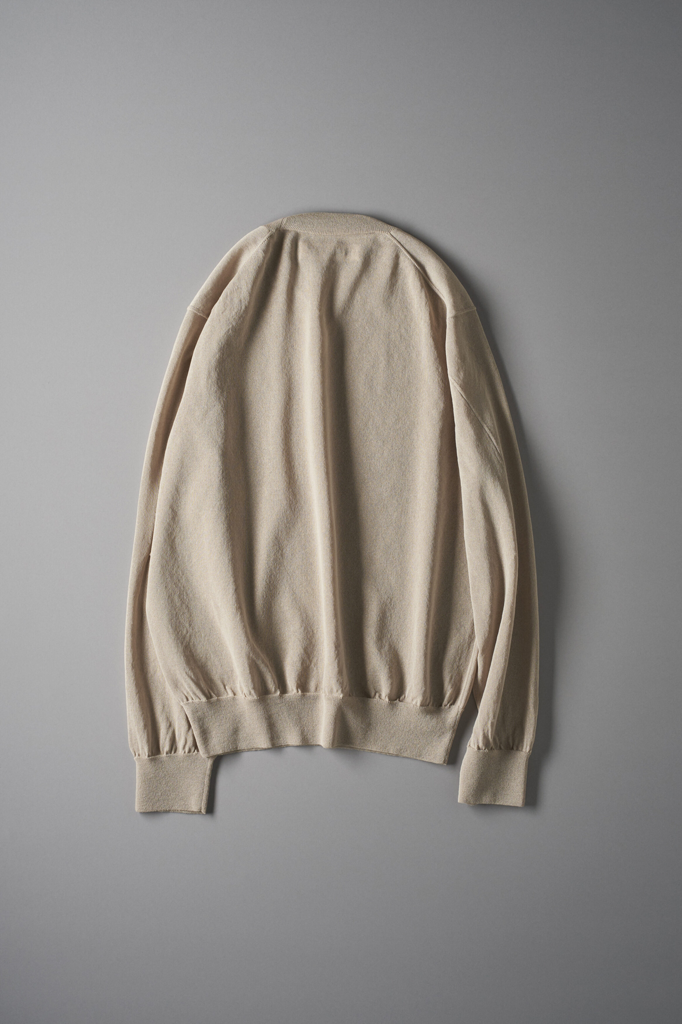 精練前の生糸のような乾いた風合いとハリをもつ、綿とポリエステルの特殊撚糸による天竺編みのセーター。 混紡糸に20デニールほどの極めて細いポリエステルが巻かれた特殊な構造の糸により、天然繊維を想起させる自然な表情をもちつつ合成繊維の塑性によって、うっすらと透けるほどの繊細な編地でありながらも空気を含んだ柔らかなシルエットを生みだしています。