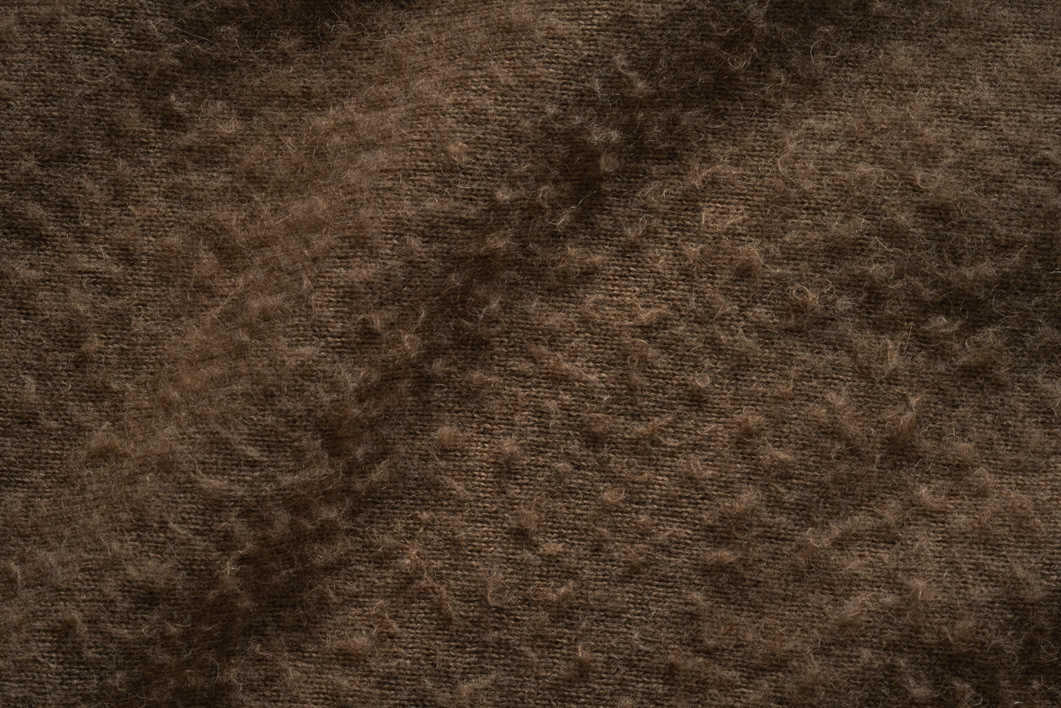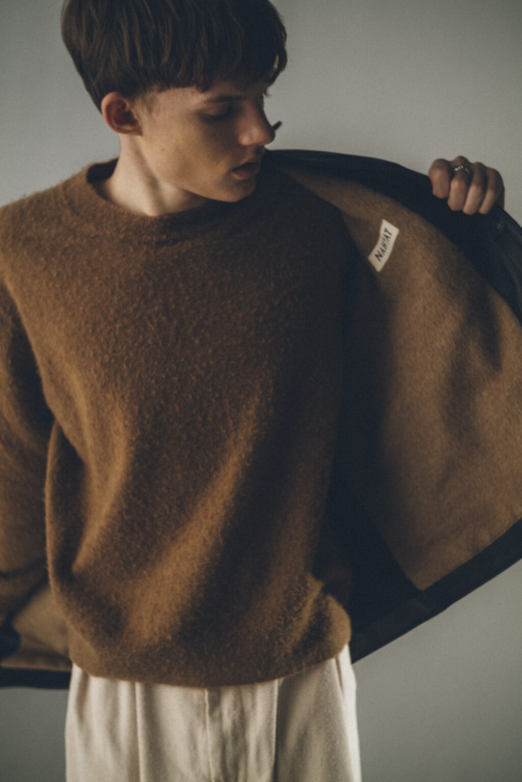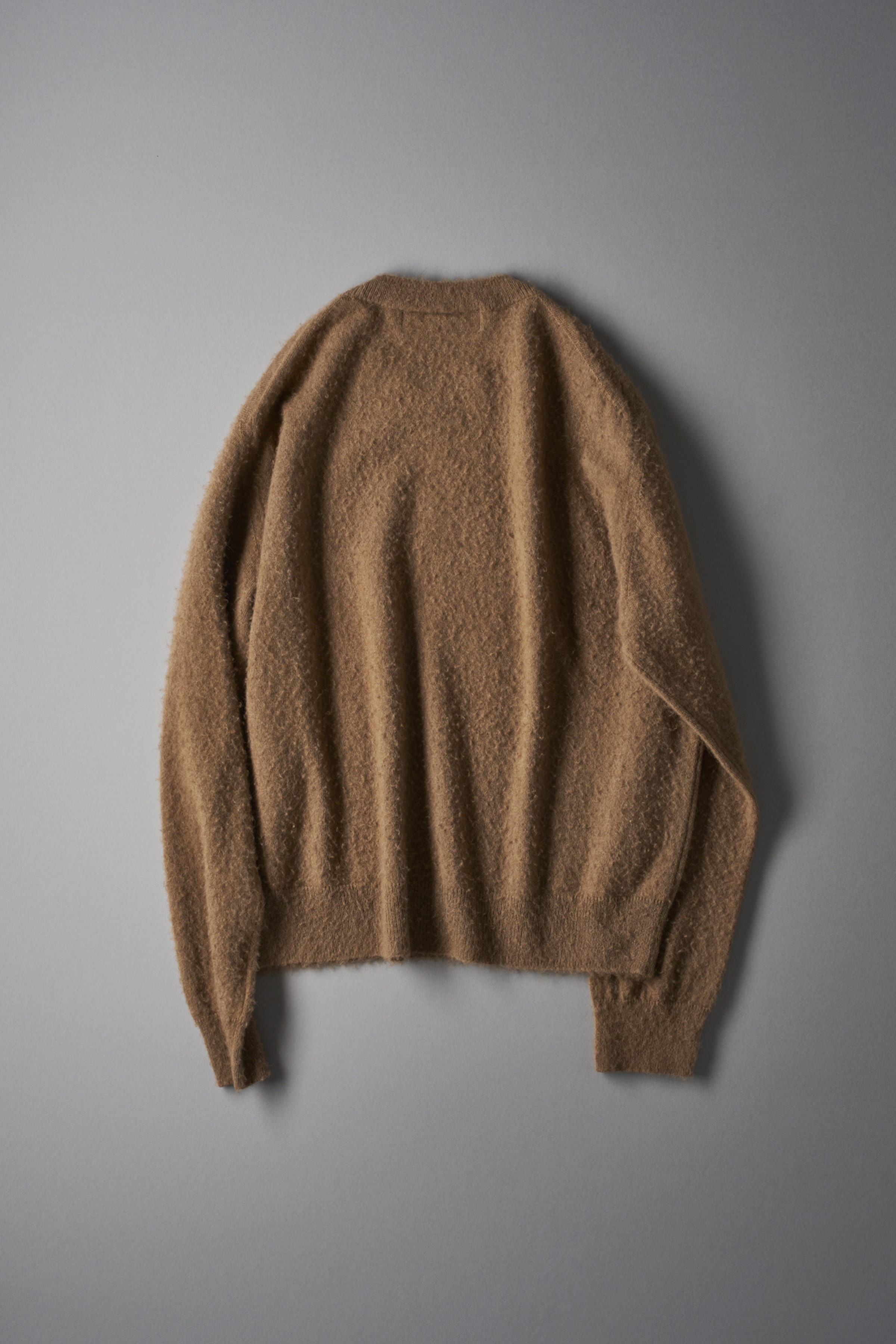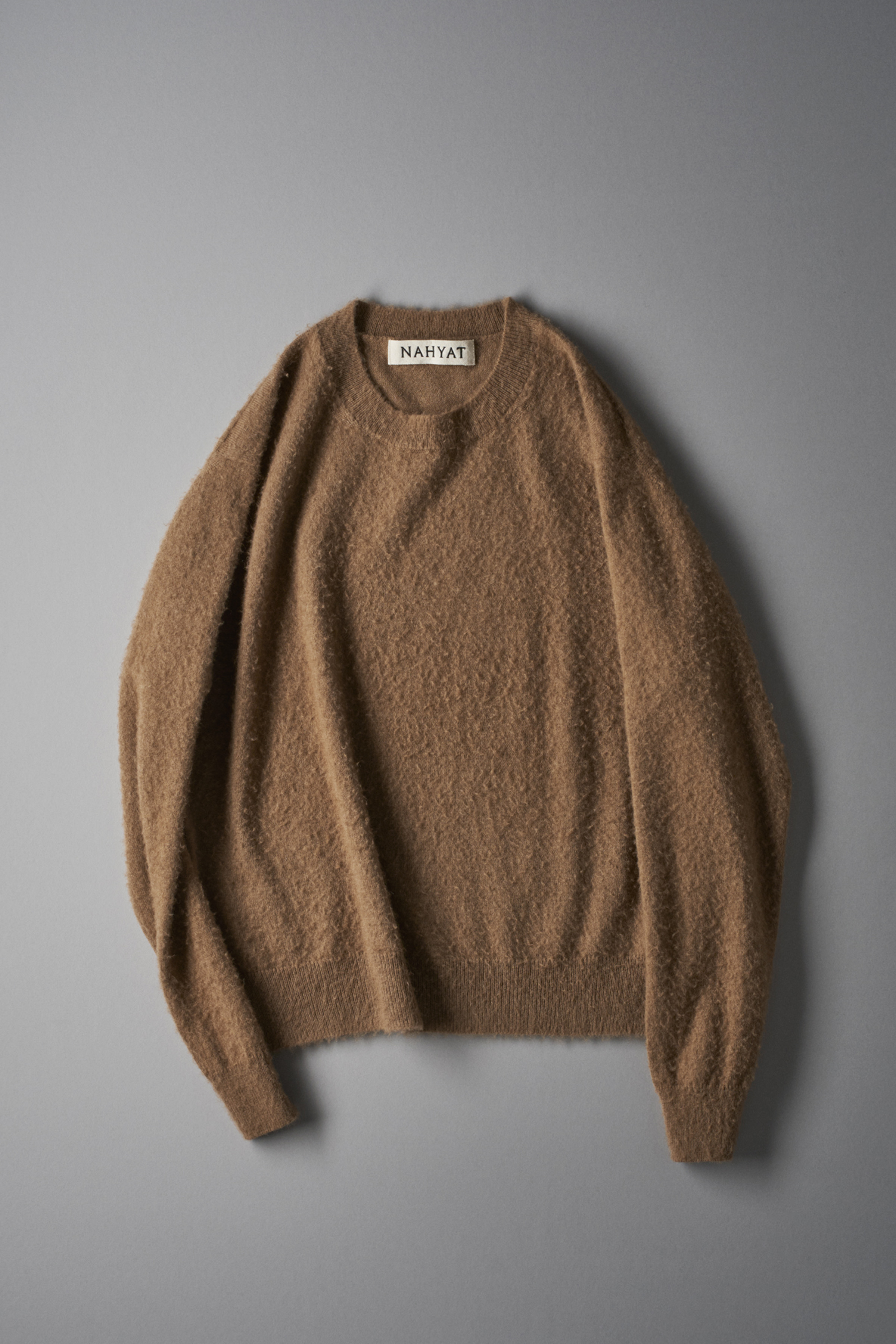 フタコブラクダ特有の赤みを帯びた茶をそのままに、甘く編んだ後ナッピングで仕上げたセーター。 砂漠地帯を想起させるプリミティブな表情をナッピングにより丁寧に引き出しています。優れた保温性、吸湿性もさることながら、羊毛とは異なる乾いた質感もキャメルの大きな特徴です。