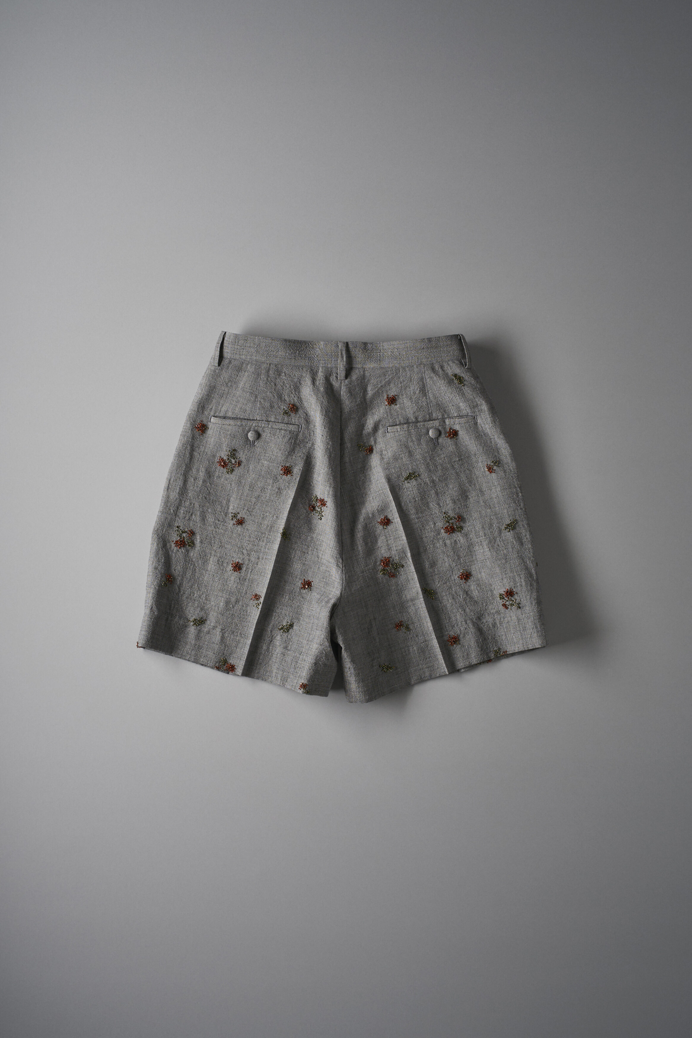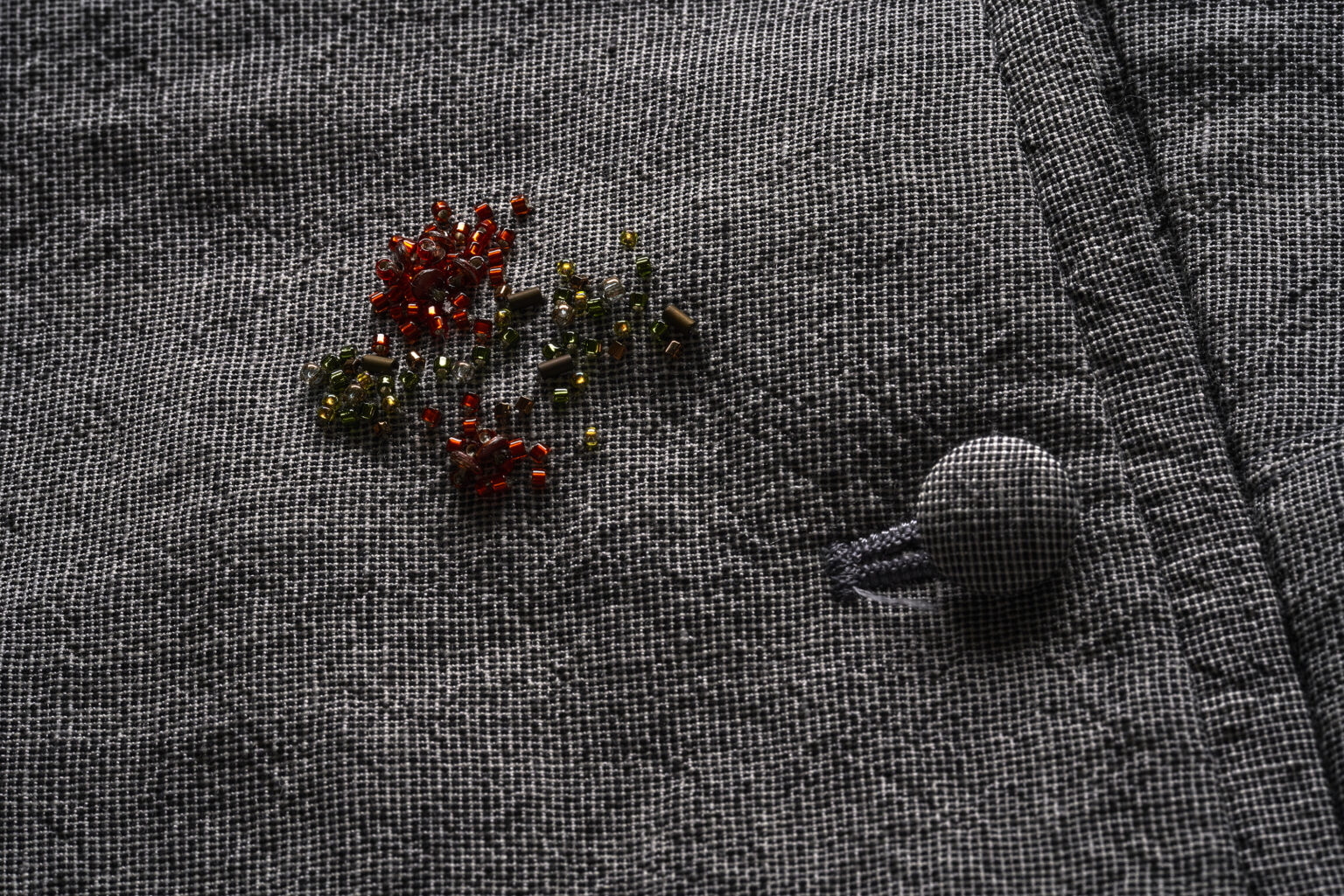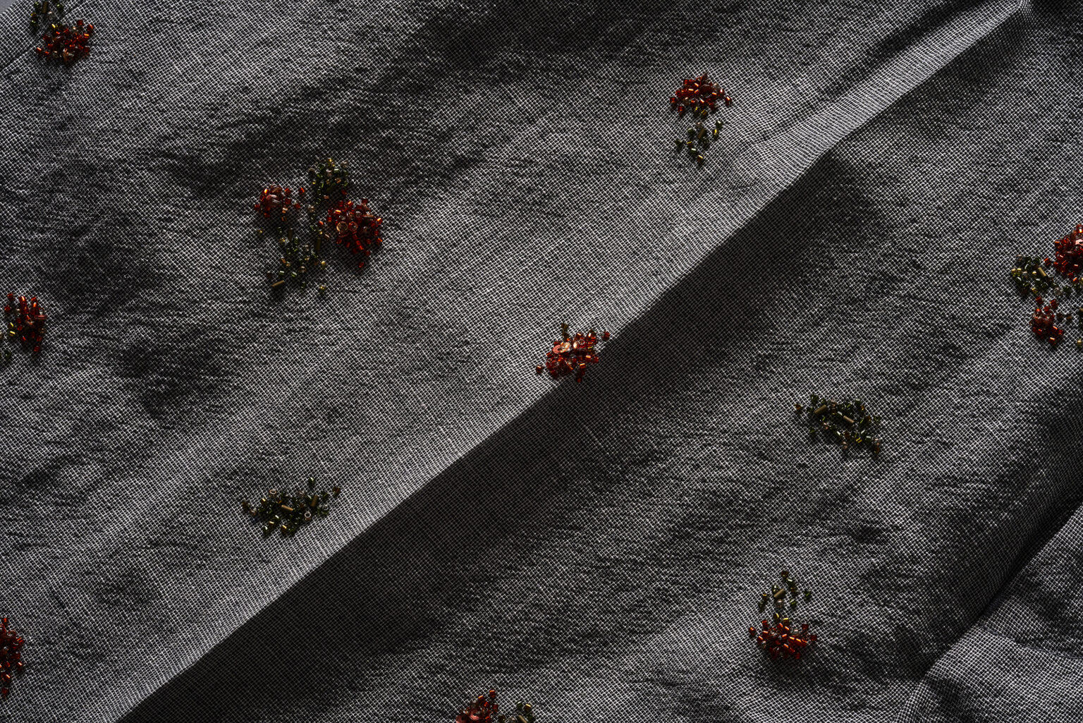 豪州産メリノの梳毛とリネンを交織したドライな肌合いをもつウールリネン。 洗い晒され縮絨した羊毛が、リネンの節を不規則に隆起させ剛質な表情に。ミニマムに格子を描くように白、黒、グレーを配することで織目を引き立たせながら深みのある色みを作りだしています。 量感に富んだ抽象的な花のモチーフは、ガラスビーズやスパンコール数種を用いてすべて手作業によりあしらわれています。