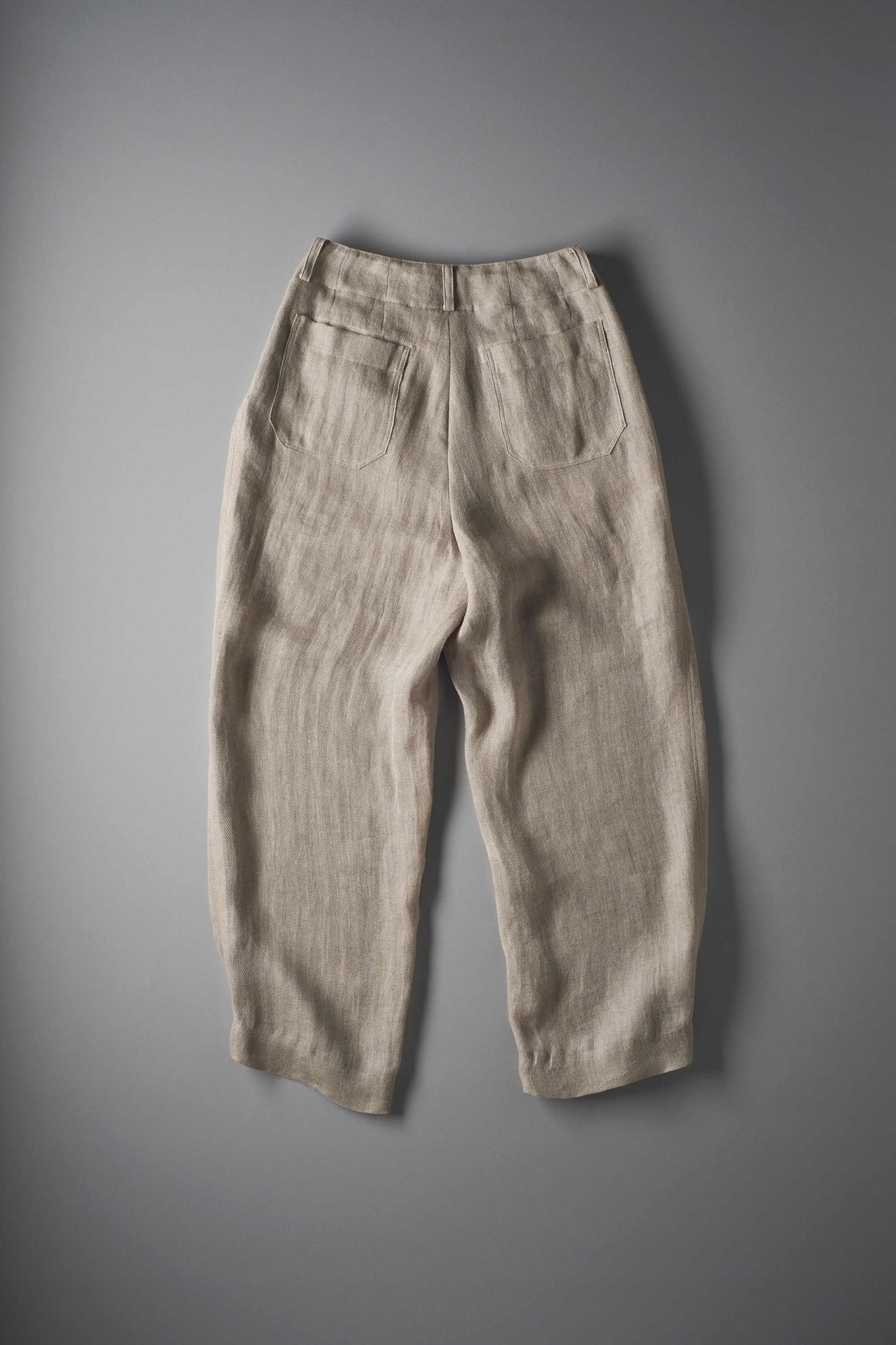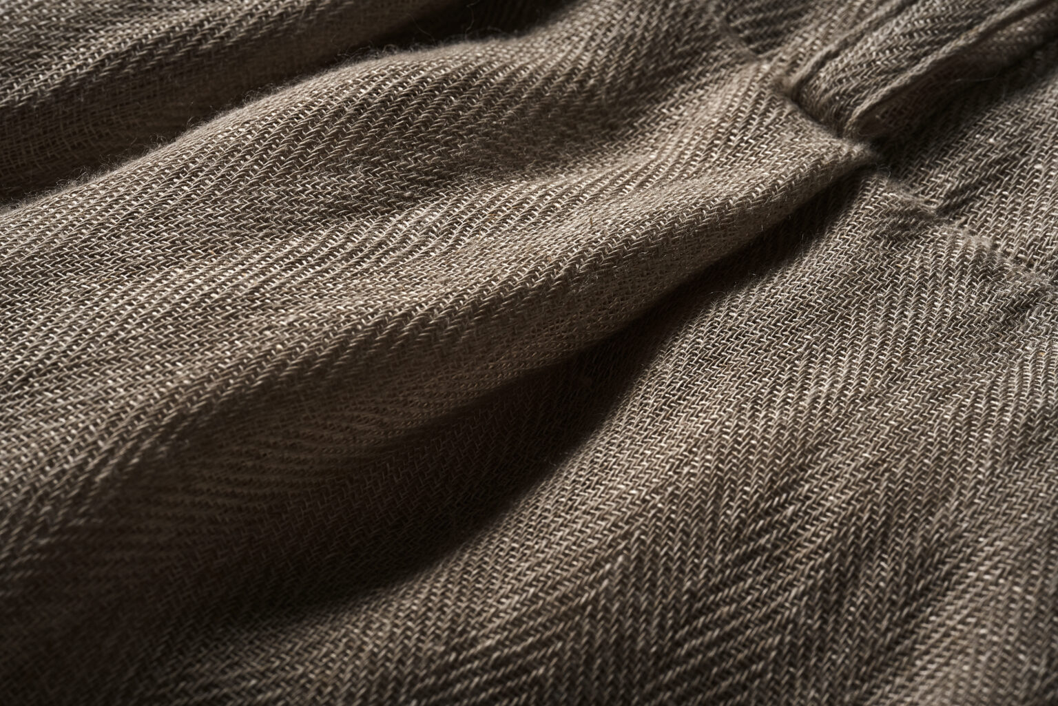蚊帳のようにうすらと光を透過するほどに極度に甘く織られた麻地。 透かせば柔らかに顕れるヘリンボーンや、麻特有のしなりを残しながらも程度よくたわみ流れるようなドレープなど、麻の繊維が含有する幽玄さを旧式のシャトル織機によって余すことなく引き出しています。 *この製品は打ち込みが甘く透け感のある繊細な生地を使用しております。摩擦や引っ掛かりなどにより滑脱する恐れがございますので、ご着用の際は十分お気をつけください。
