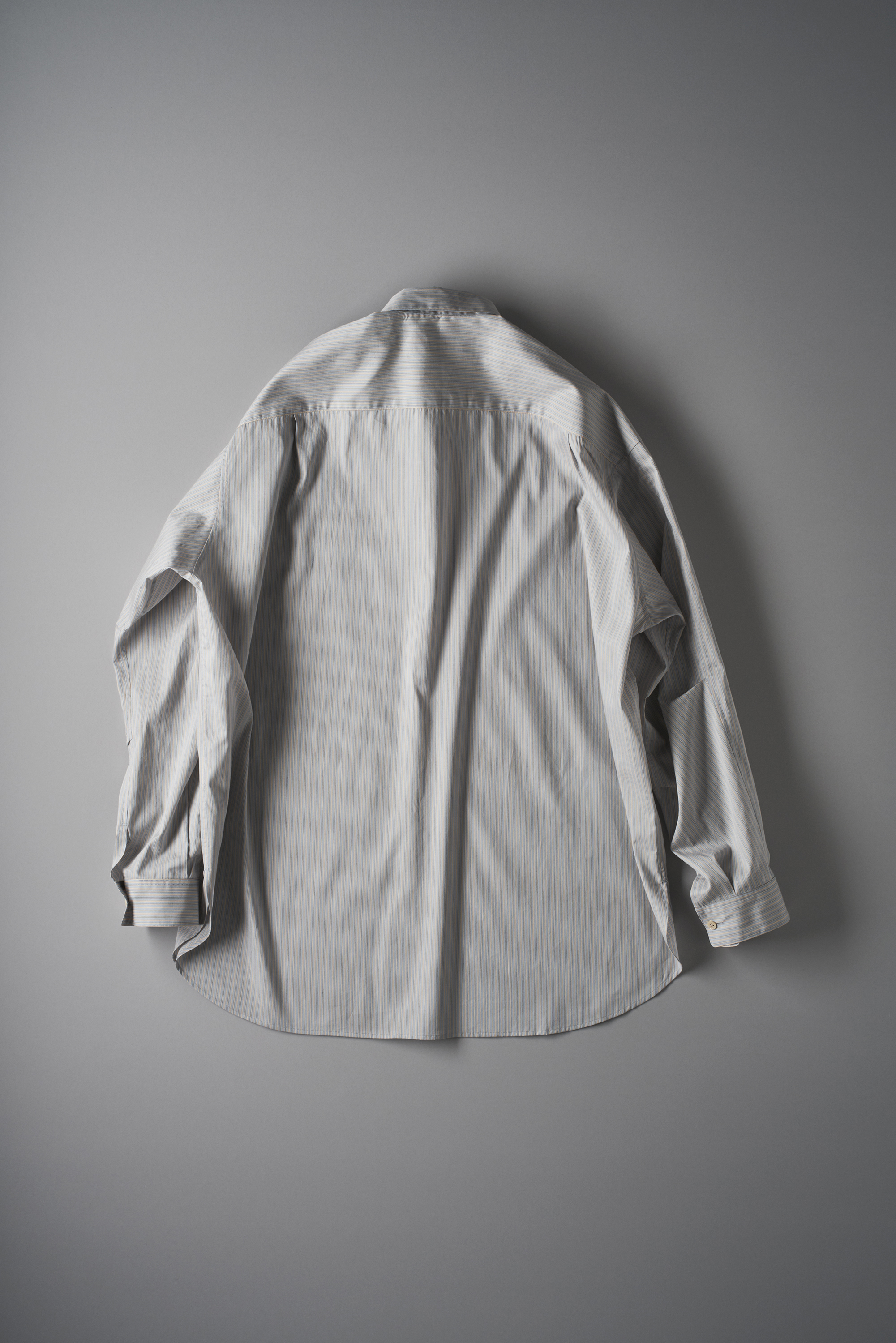 霞みがかった鈍いブルーに橙色、ベージュ、濃紺と多色を織り込んだストライプ地。 経糸に対し、より細い100番単糸を緯糸に用いることで、経糸を際立たせクリアな縞と爽やかな配色をノイズなく作りあげています。 <ビッグサイズ型>
