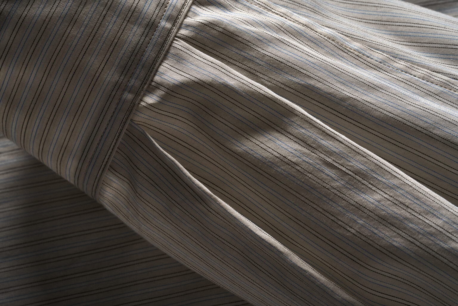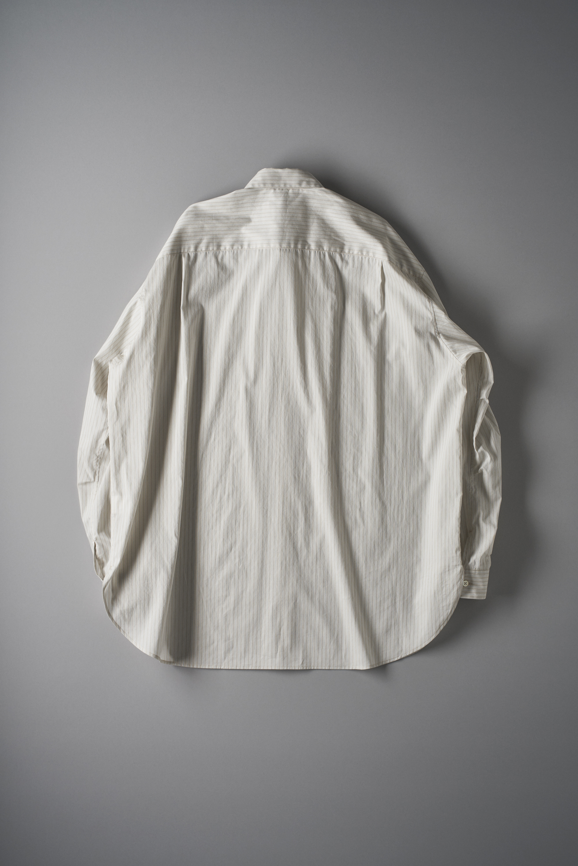 黄みを帯びた淡いグレーに水色、濃茶、白と多色を織り込んだストライプ地。 経糸に対し、より細い100番単糸を緯糸に用いることで、経糸を際立たせクリアな縞と爽やかな配色をノイズなく作りあげています。 <ビッグサイズ型>