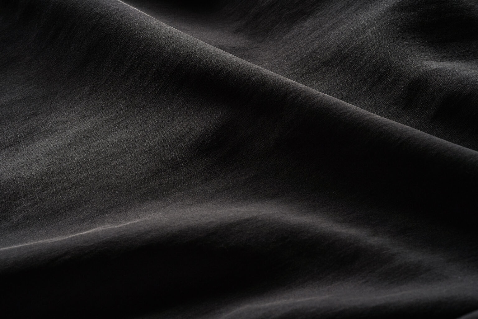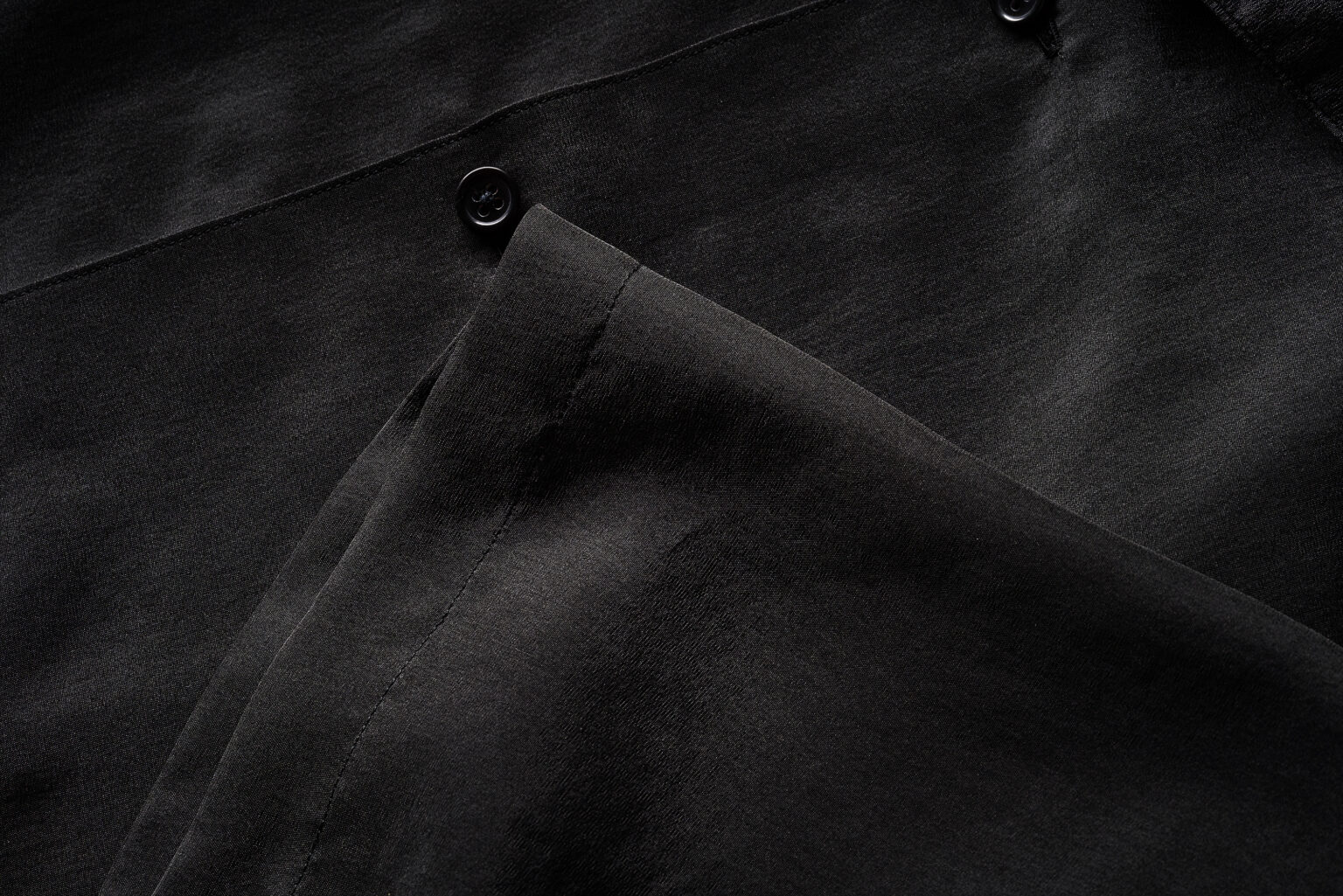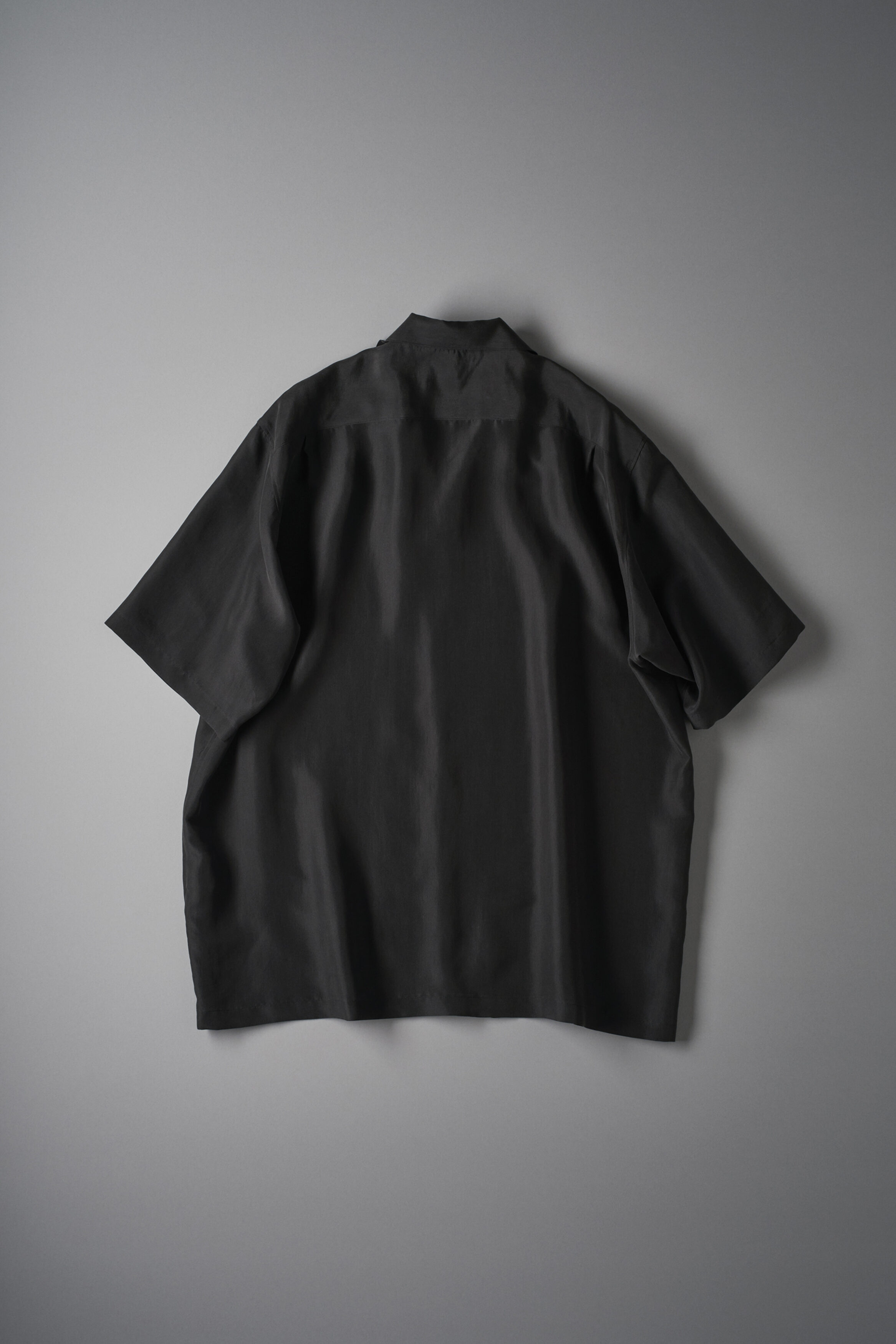 経糸、緯糸ともに生糸を用いた12匁シルクの平織に摩擦による微起毛と酵素処理を加えた織地。 起毛後、熱乾燥の工程で立たせた毛羽を酵素によって整えることで、その微細な繊維質をより露わにし白みを帯びた柔らかな光の反射と、空気を含んだ軽やかな風合いを引き出しています。 <ショートスリーブ型> ※撮影環境の影響で、実物より光沢が強く映っています。