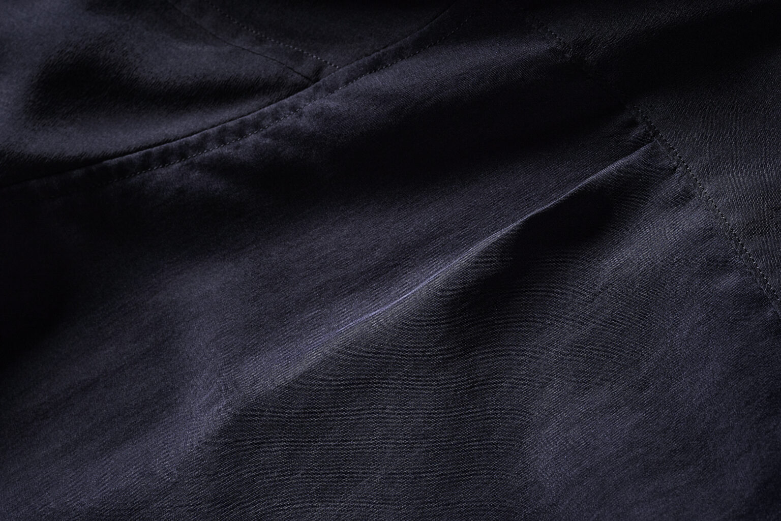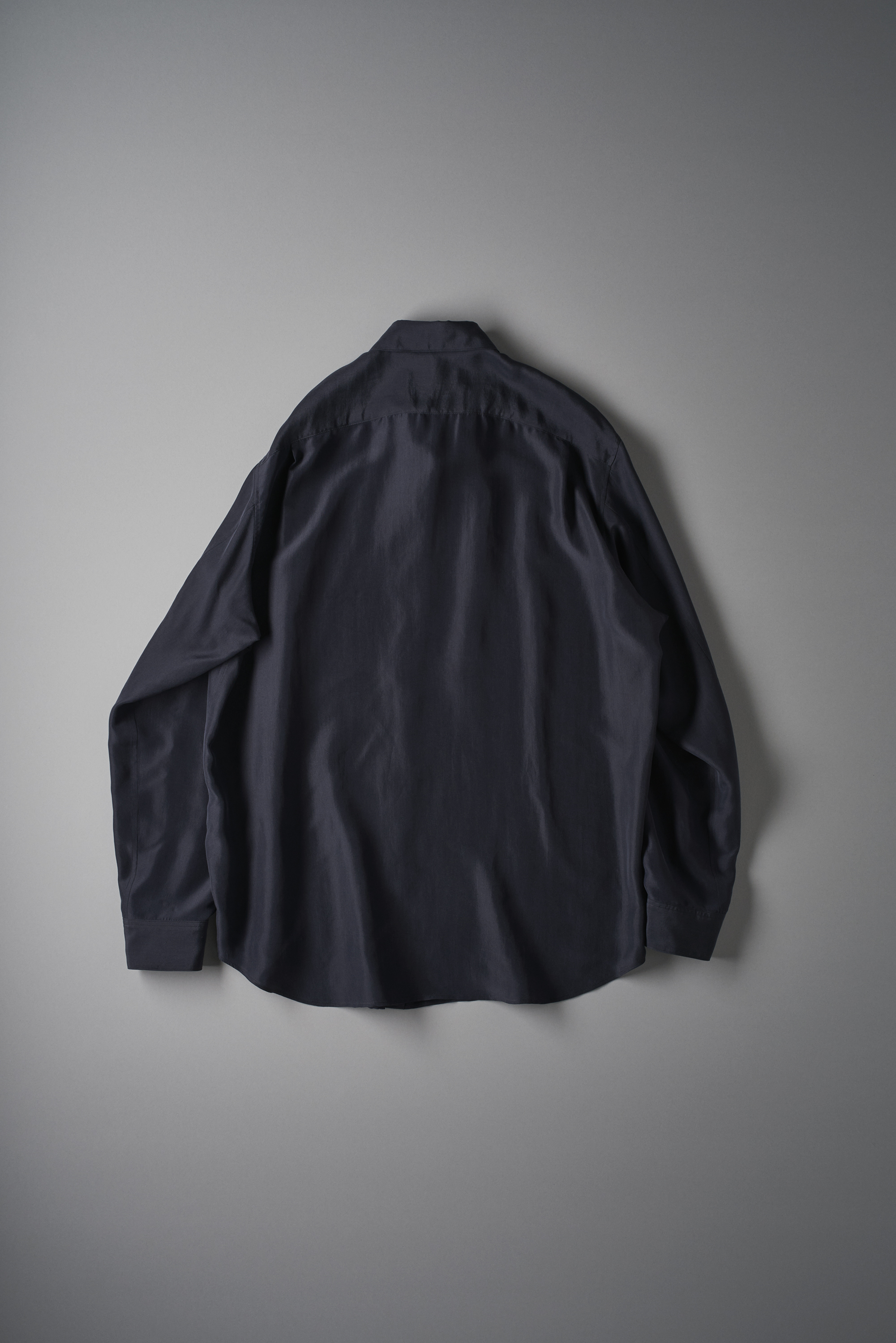 経糸、緯糸ともに生糸を用いた12匁シルクの平織に摩擦による微起毛と酵素処理を加えた織地。 起毛後、熱乾燥の工程で立たせた毛羽を酵素によって整えることで、その微細な繊維質をより露わにし白みを帯びた柔らかな光の反射と、空気を含んだ軽やかな風合いを引き出しています。 <ロングスリーブ型> ※撮影環境の影響で、実物より光沢が強く映っています。
