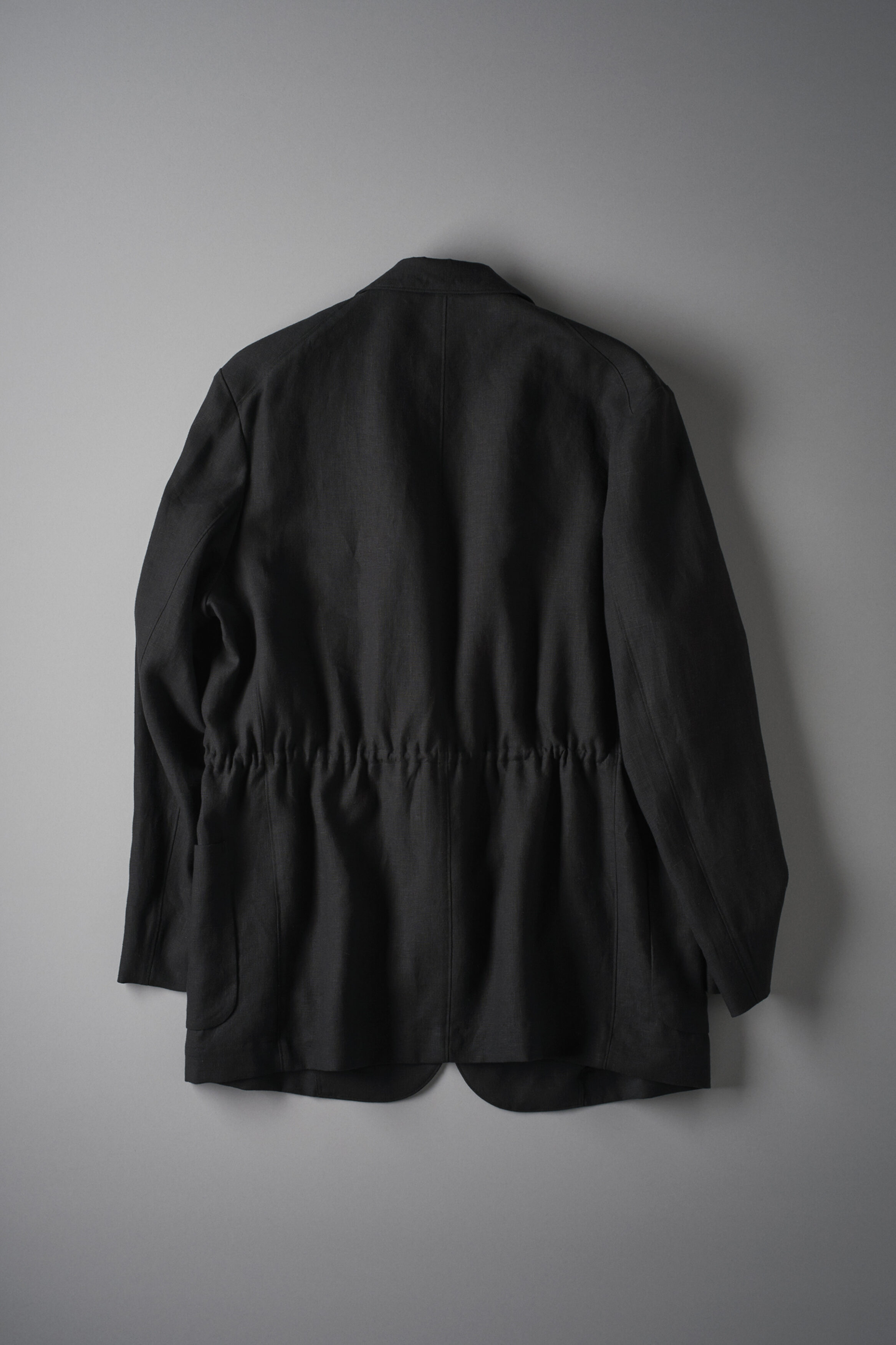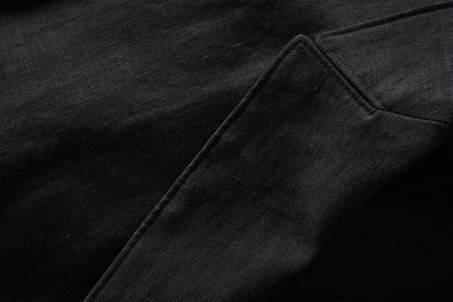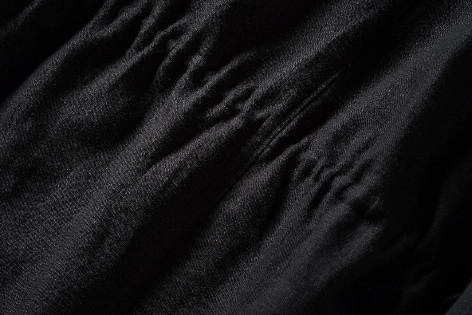 羊毛のこっくりとした黒とは異なる靭皮繊維固有の白んだ柔和な黒と、幾度も洗い解されたような丸みあるふくらみをもつリネンの平織。 弾力性の高いコシとしっかりとした目付けが、ゆるやかに揺れる柔らかなドレープを作ります。