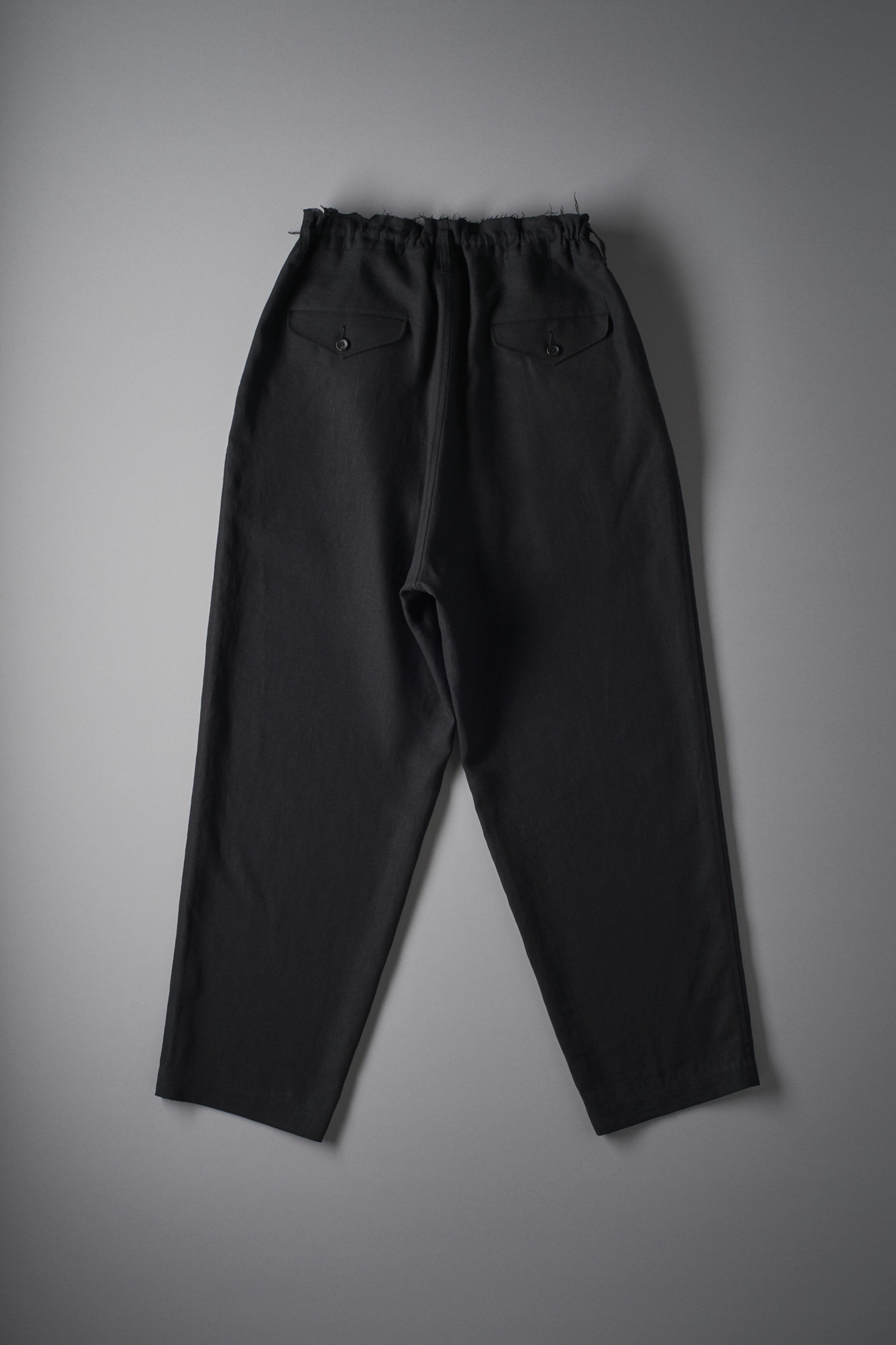 羊毛のこっくりとした黒とは異なる靭皮繊維固有の白んだ柔和な黒と、幾度も洗い解されたような丸みあるふくらみをもつリネンの平織。 弾力性の高いコシとしっかりとした目付けが、ゆるやかに揺れる柔らかなドレープを作ります。