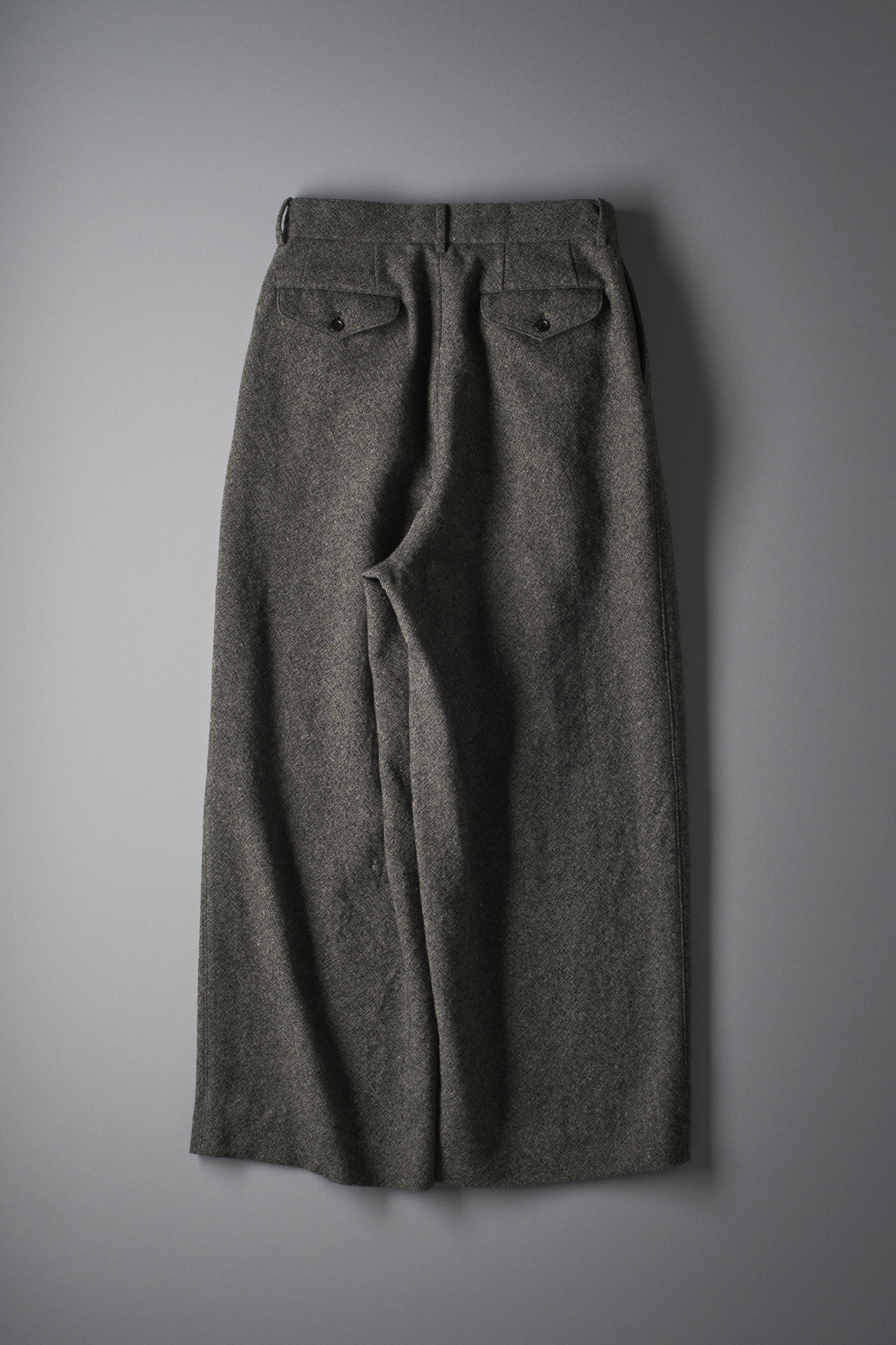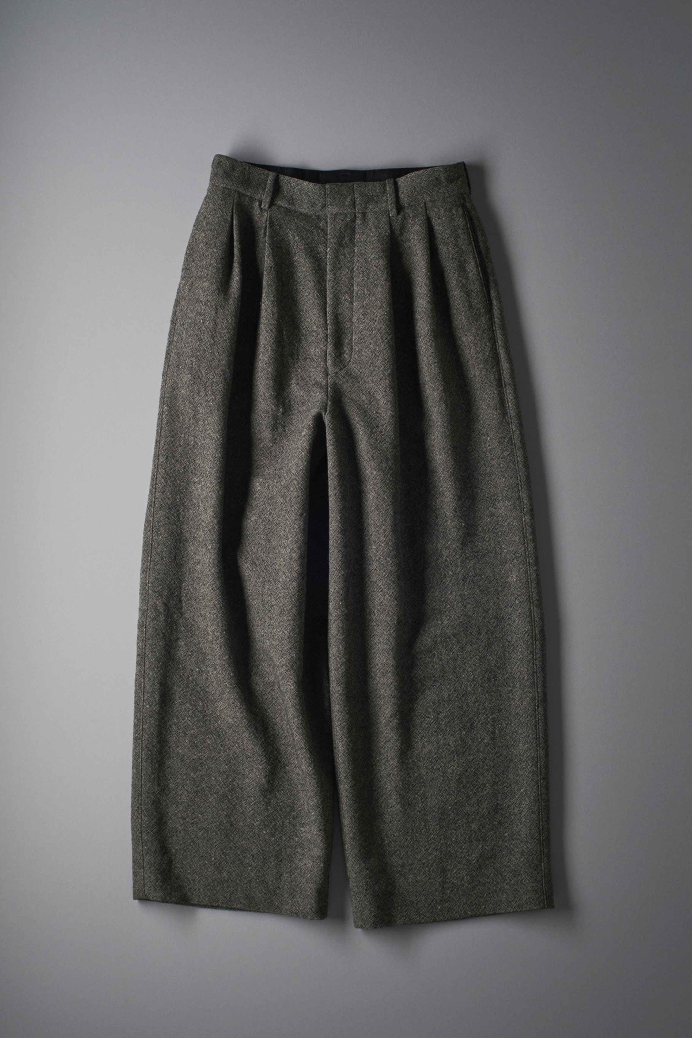 メリノウールを軸に、経糸にシルクを微量織り混ぜたツイード。 柔らかく撚り合わされた羊毛とシルクの経糸に、三子撚りでコシをつけた緯糸を織りこむことで、量感のあるゆったりとした優美なドレープを作りあげています。 <ツータックワイドシルエット> <総裏仕立て>
