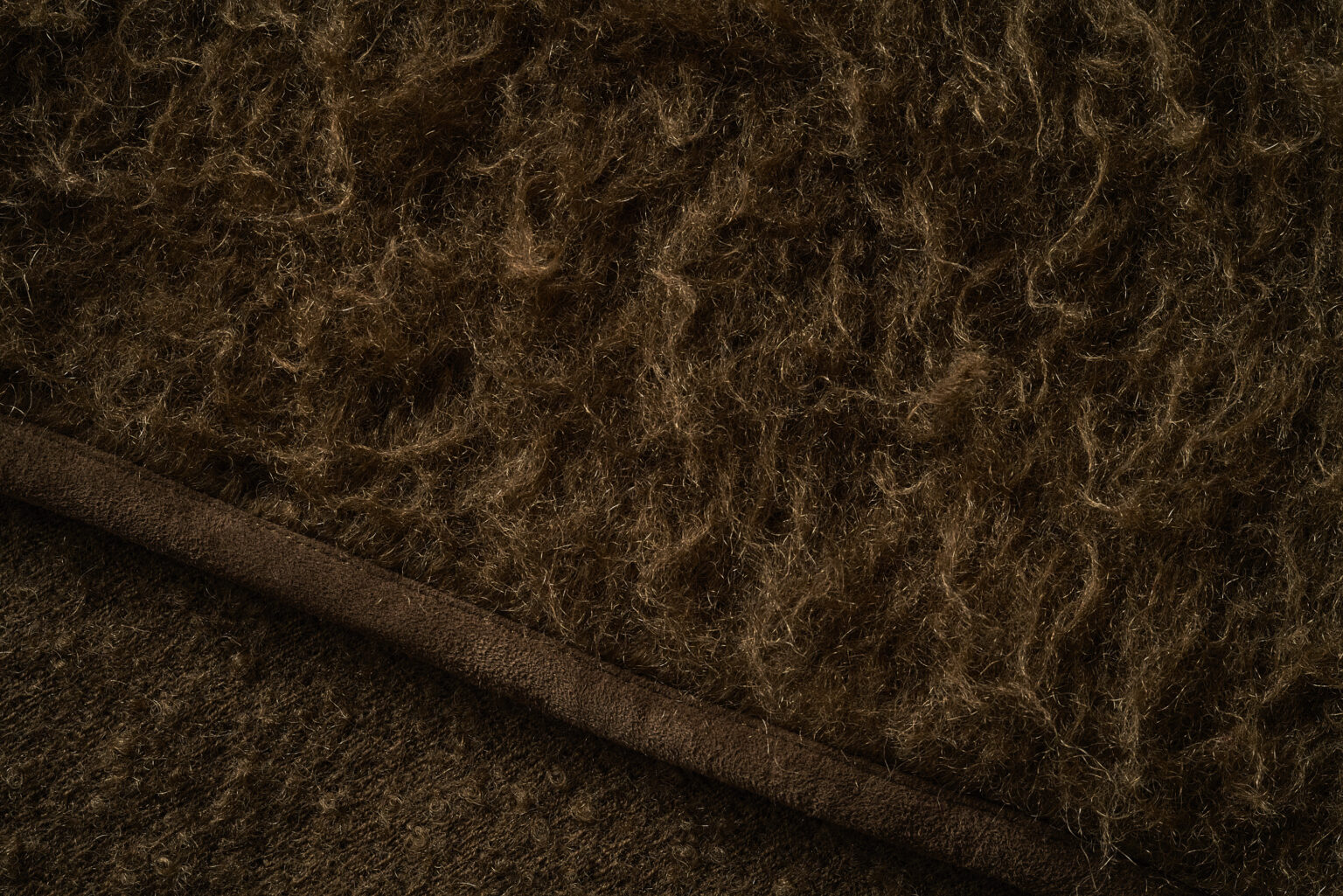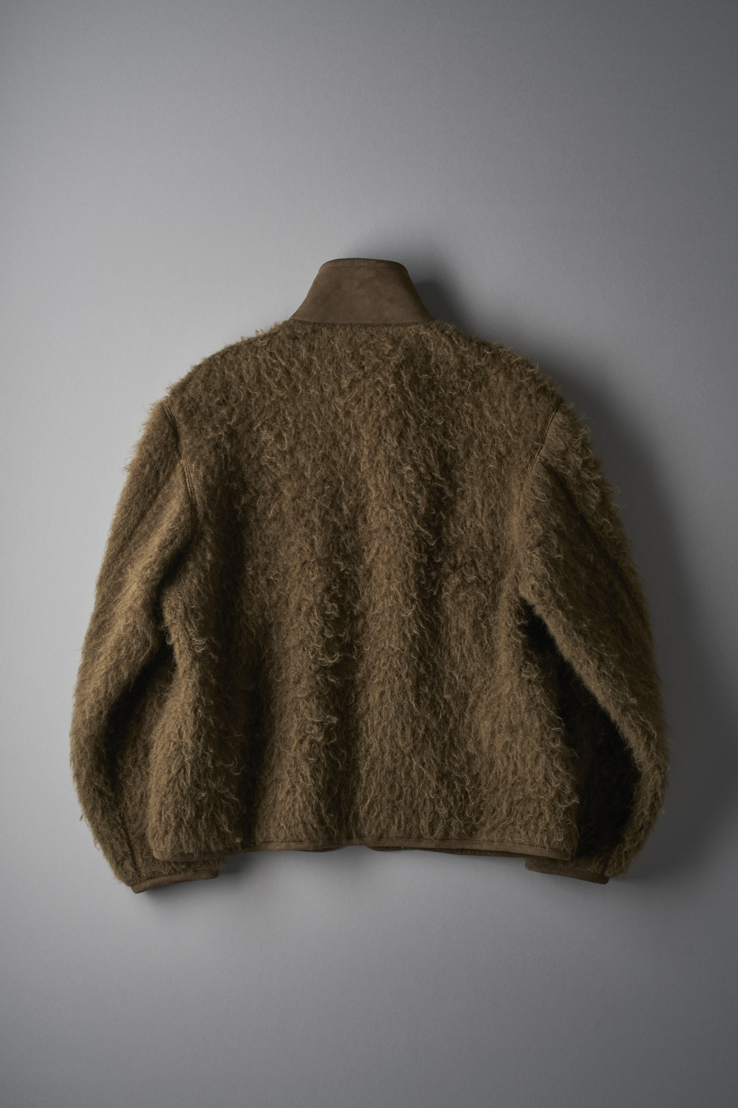 モヘヤの起毛地に手作業でナッピングを施し仕上げたフリース。 地厚なブランケットほどの厚みでありながらも軽量で保温性の高い織地と、ごく薄く漉いたラムスエードによるミニマムな仕立てによって、軽やかな着心地を作りだしています。