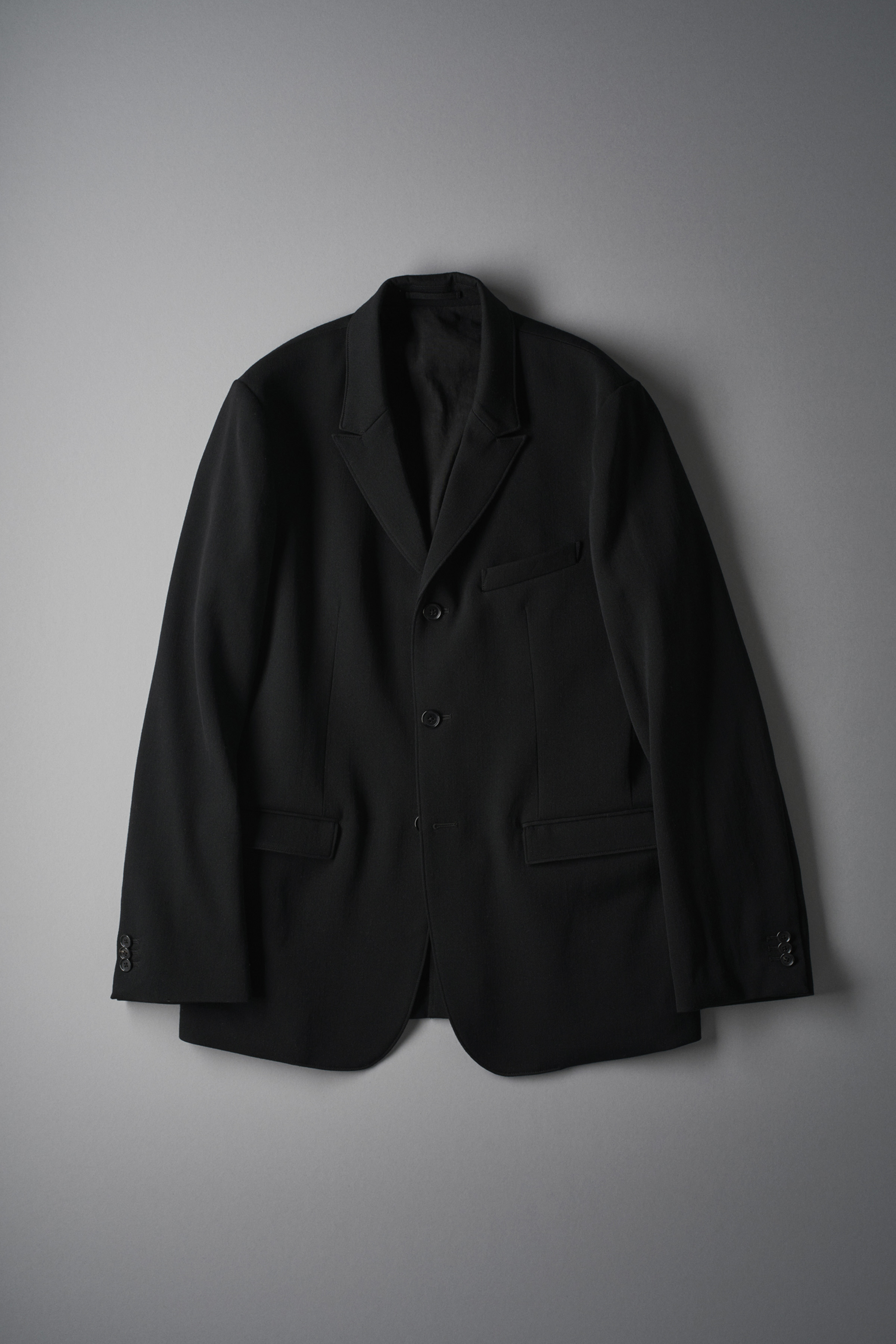 高密度に織られたウールギャバジン。 オフスケール、二重織り、ワッシャーと丁寧に重ねられた工程により、しなやかさ、厚み、弾力とが非常にバランスよく整えられた織地。芯のあるドレープによって、柔らかくも重みのあるシルエットを作りあげます。 <背抜き仕立て> <内ポケット1ケあり>
