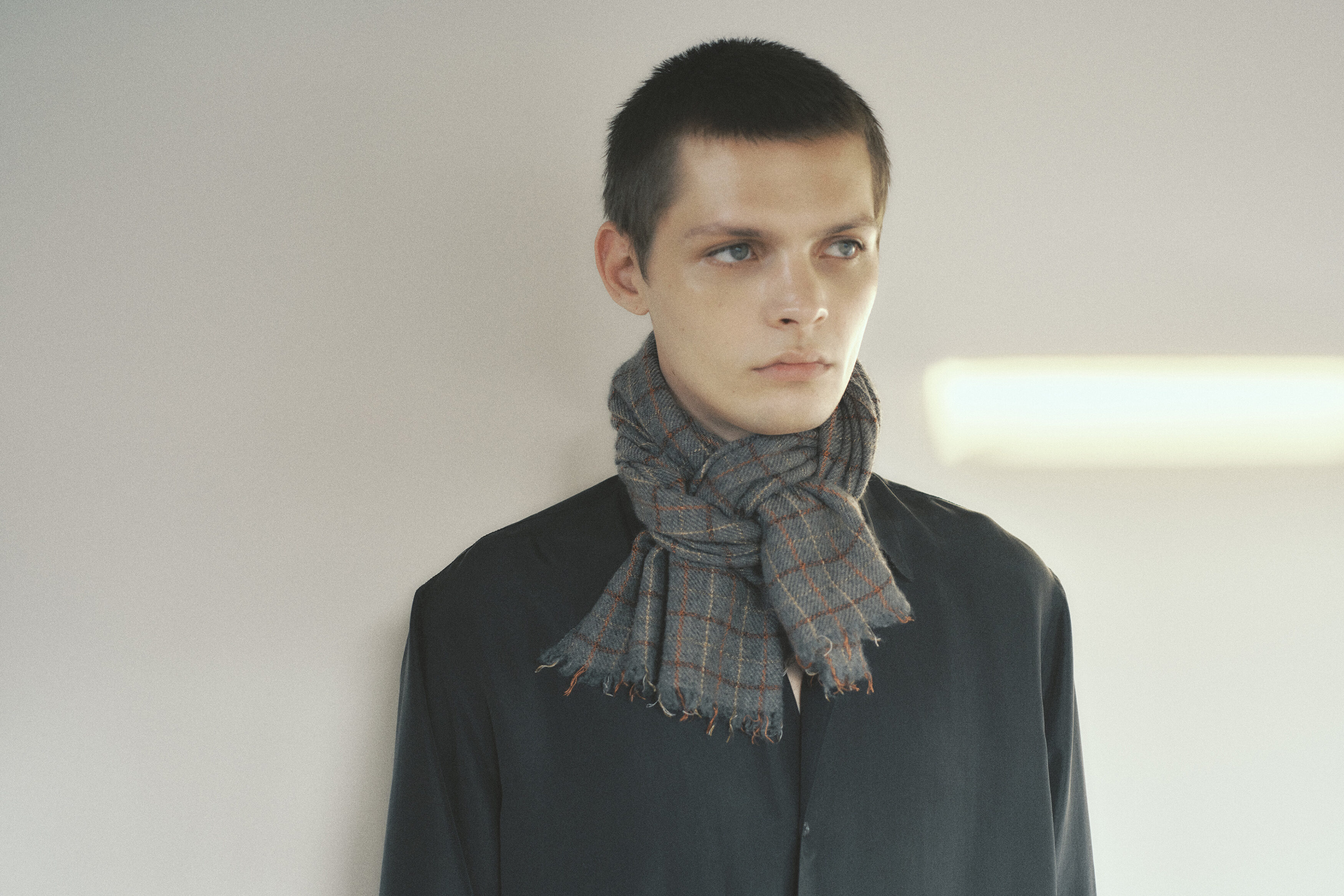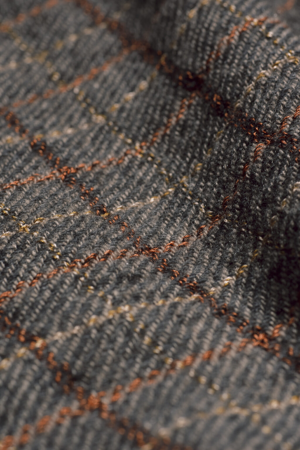モンゴル産カシミヤの綾織に、二種のシルクの杢糸を交織したピンチェックの”mini stole”。